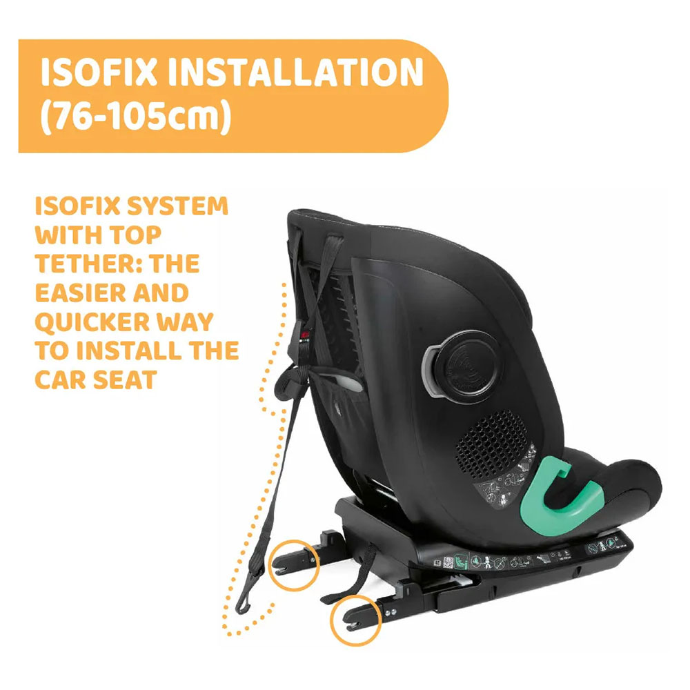 - Installation is simple and secure using Isofix connectors and the Top Tether belt.