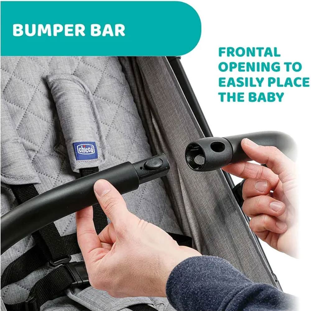 - Bumper bar with a frontal opening; usable to carry the stroller when folded.