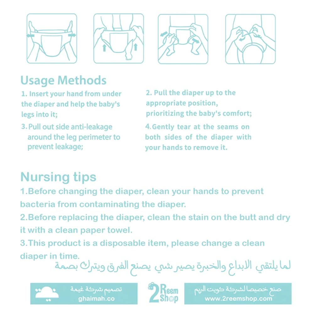 Tape Diapers: Designed in Kuwait with natural materials and high absorption technology to suit the local climate and protect sensitive baby skin.