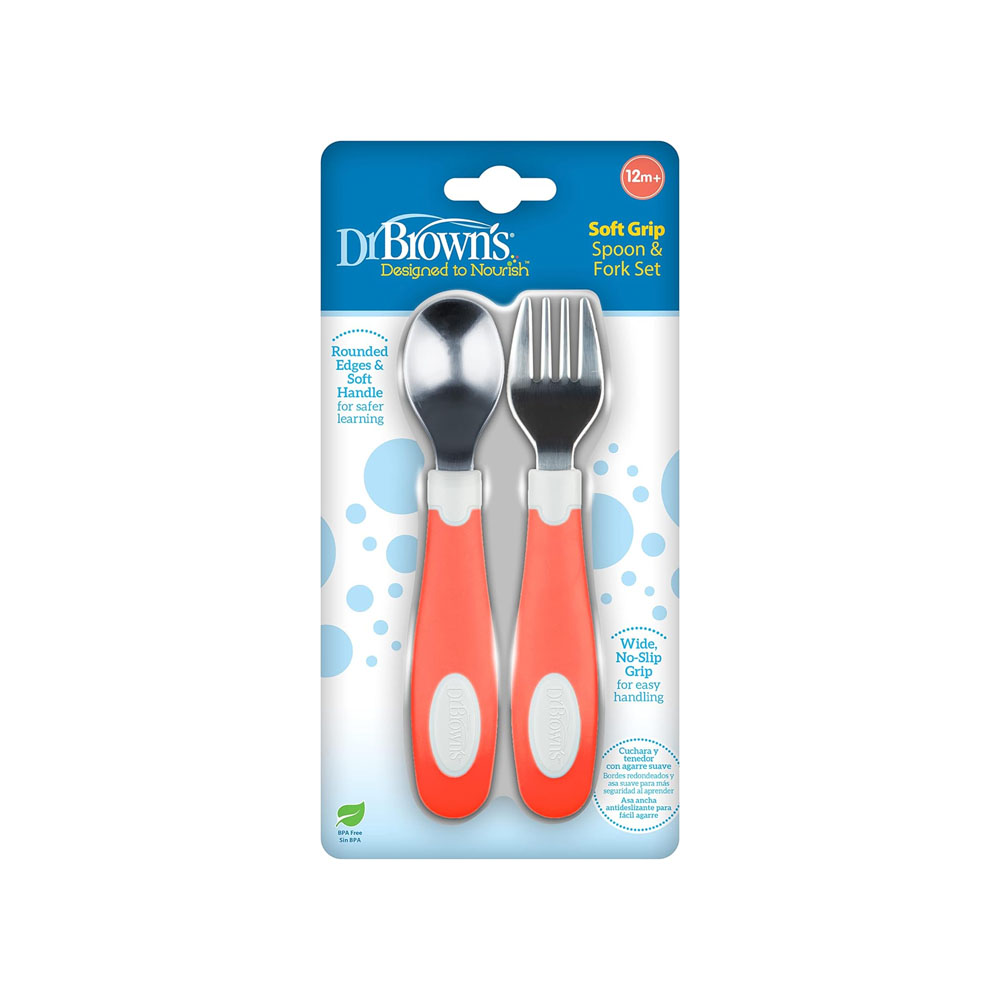 دكتور براونز مجموعة ملعقة وشوكة بمقبض ناعم (12 شهر+) – أحمر