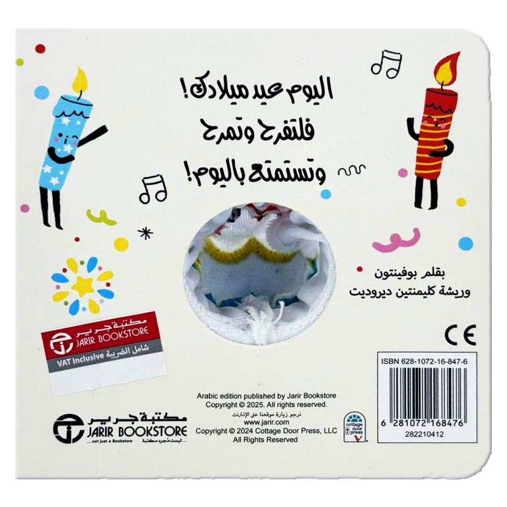 Soft-Touch Book: An interactive soft-touch book featuring a small cupcake puppet attached, designed to celebrate a birthday and encourage fun and enjoyment of the special day.