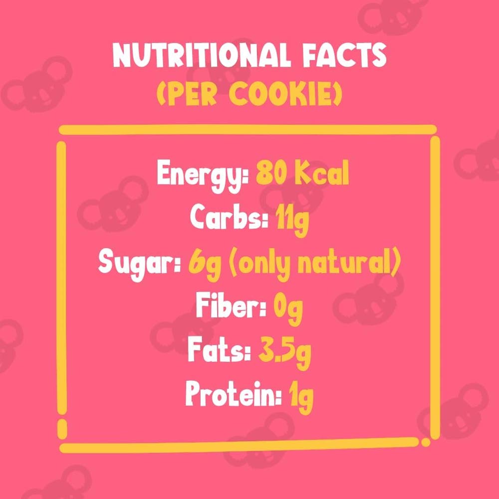 Nutrition (Per Cookie): Energy (80 Kcal), Protein (1g), Natural Sugar (6g).