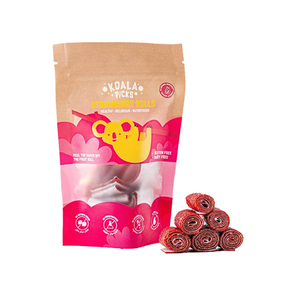 Strawberry Rolls: Sweet and fruity snack rolls packed with real strawberries and honey, providing a healthy, refined sugar-free source of vitamins for kids’ lunchboxes and family enjoyment.