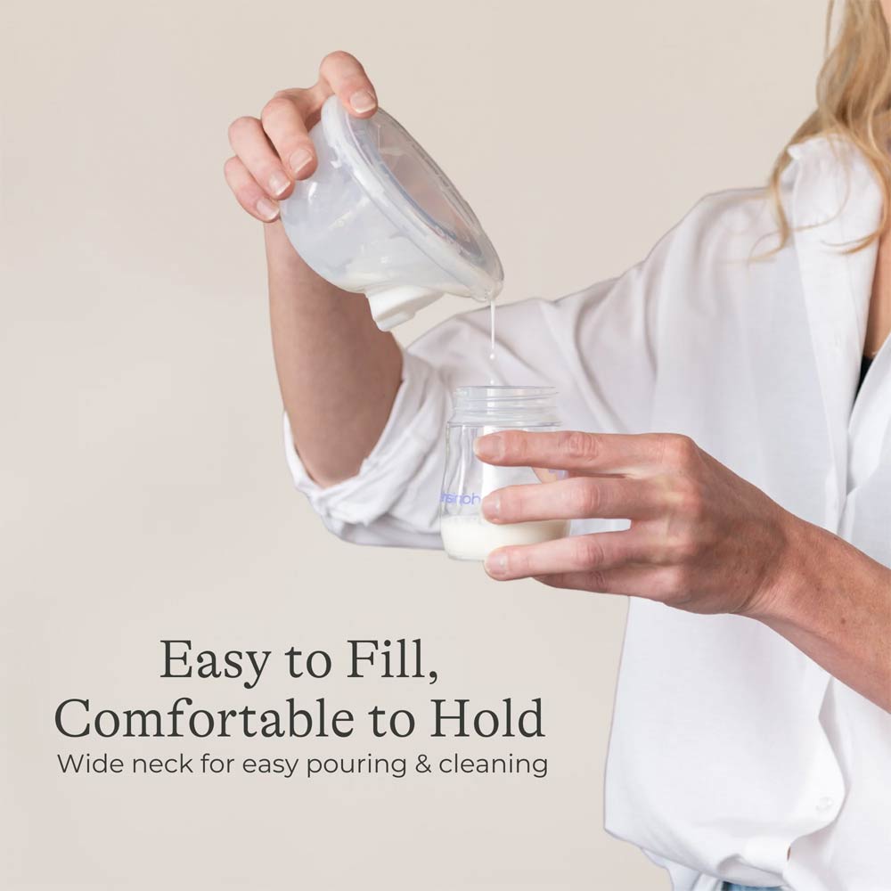 Milk Storage Bottles: Maximum convenience, allowing you to pump, store, and feed. They feature a wide-neck design for easy cleaning and are stackable with leak-proof lids.