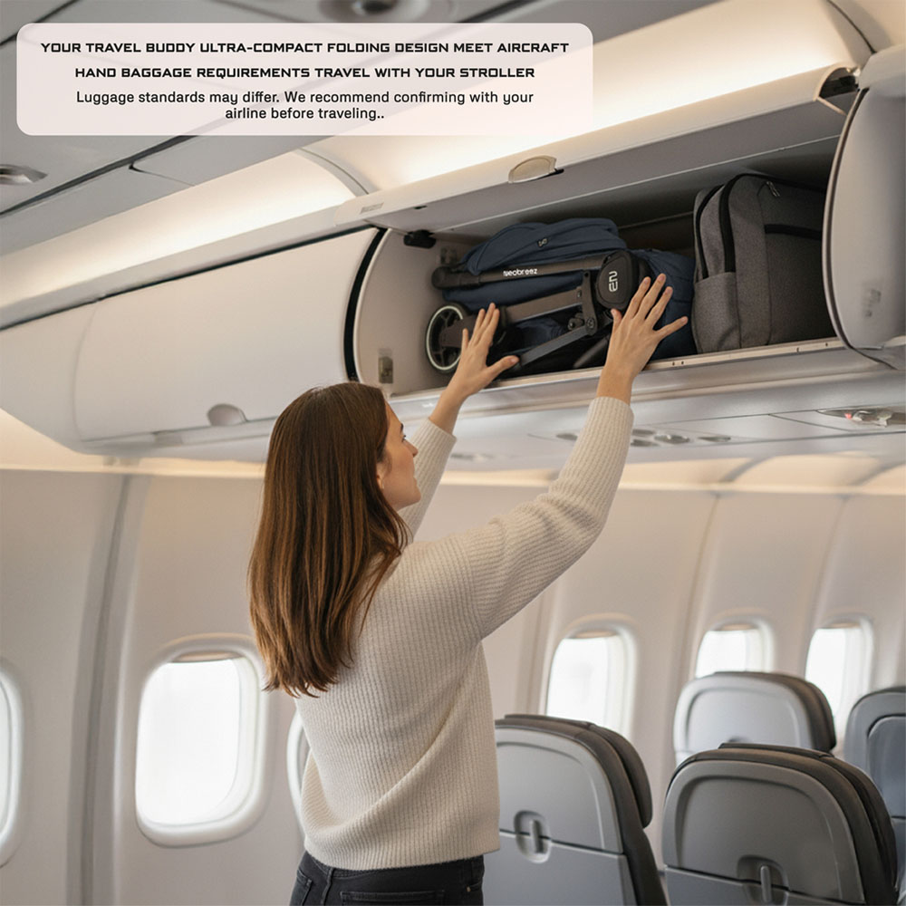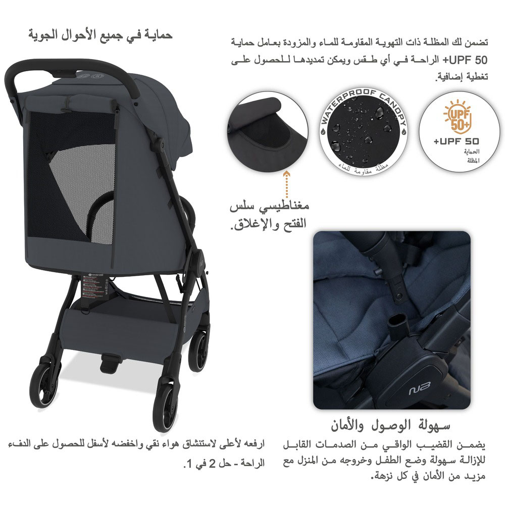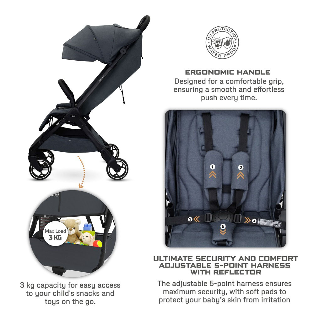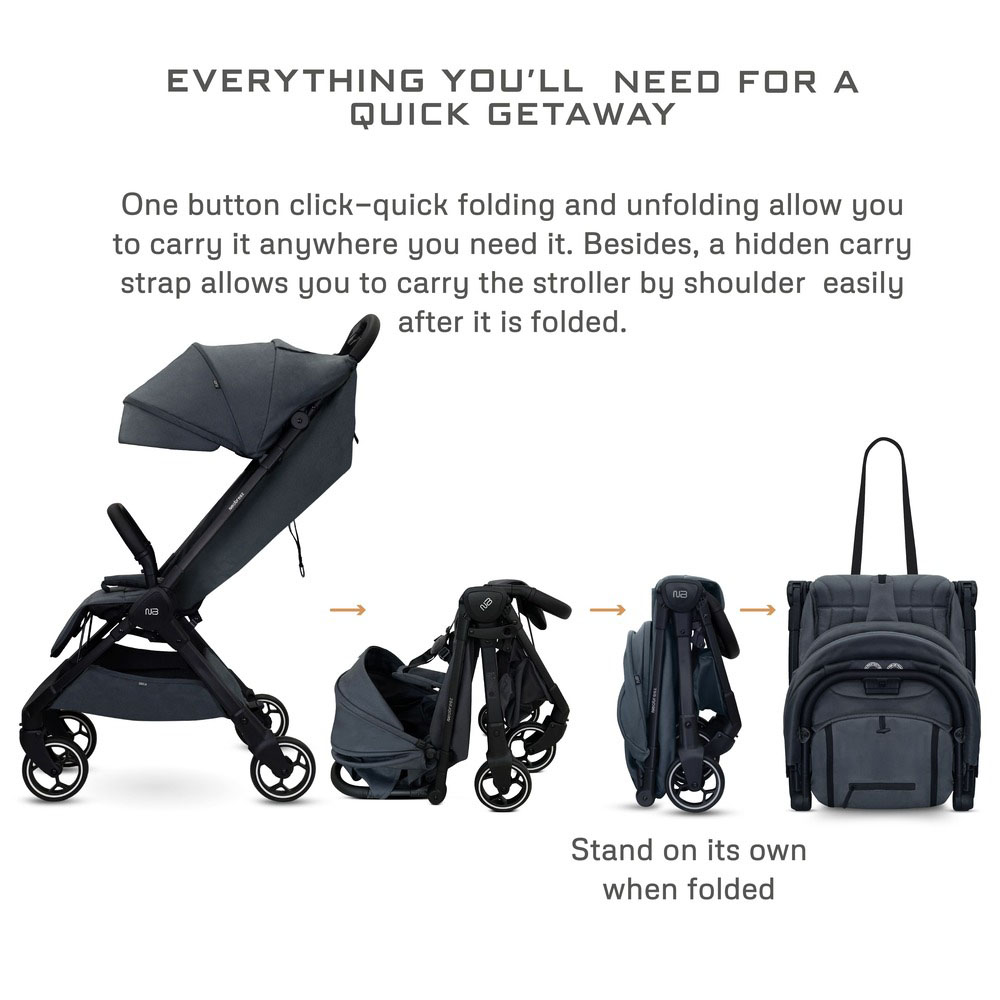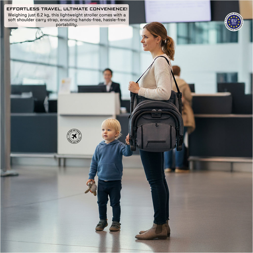 Compact Stroller: Lightweight and cabin-friendly stroller, featuring an effortless fold, full suspension, and a feature-packed design for travel with children.