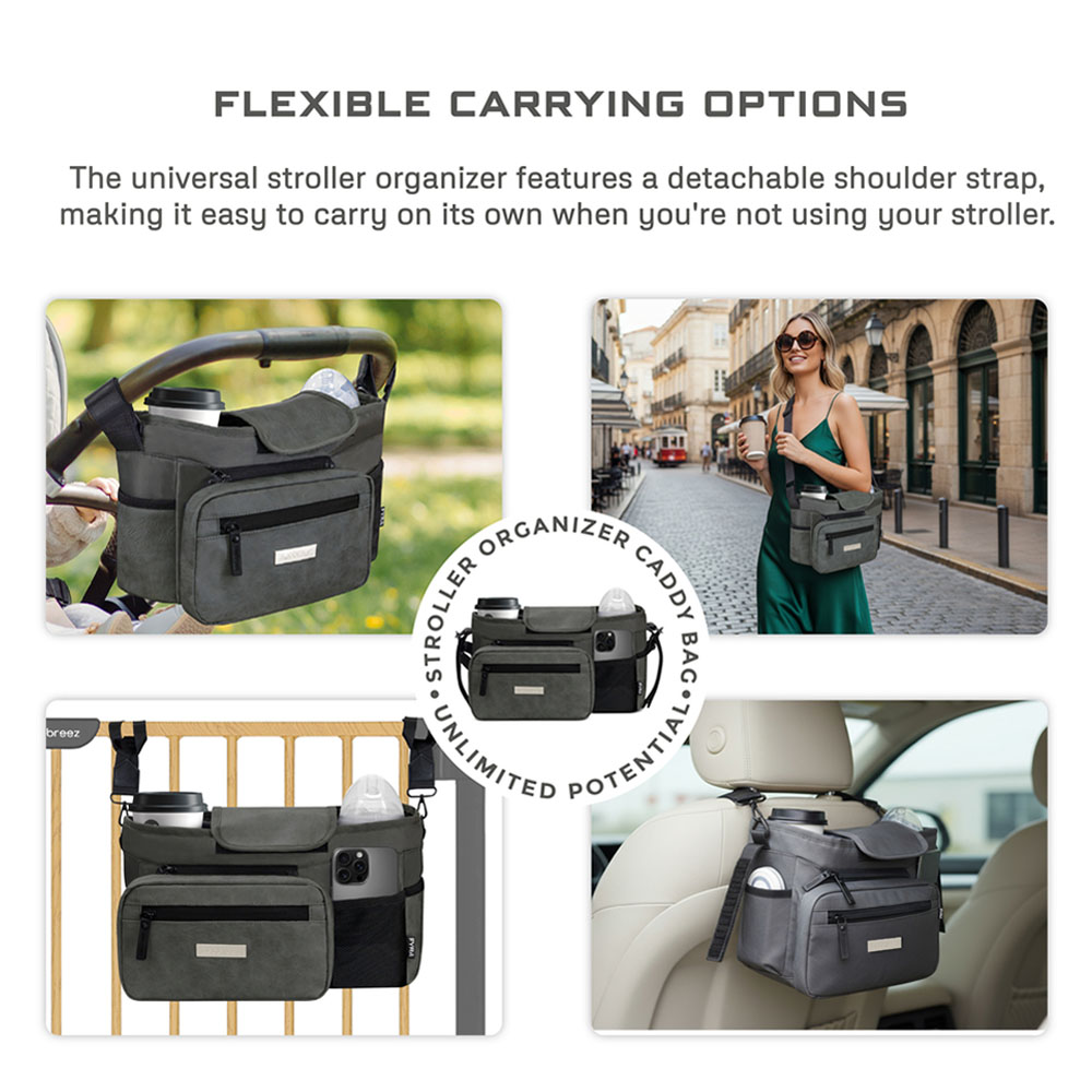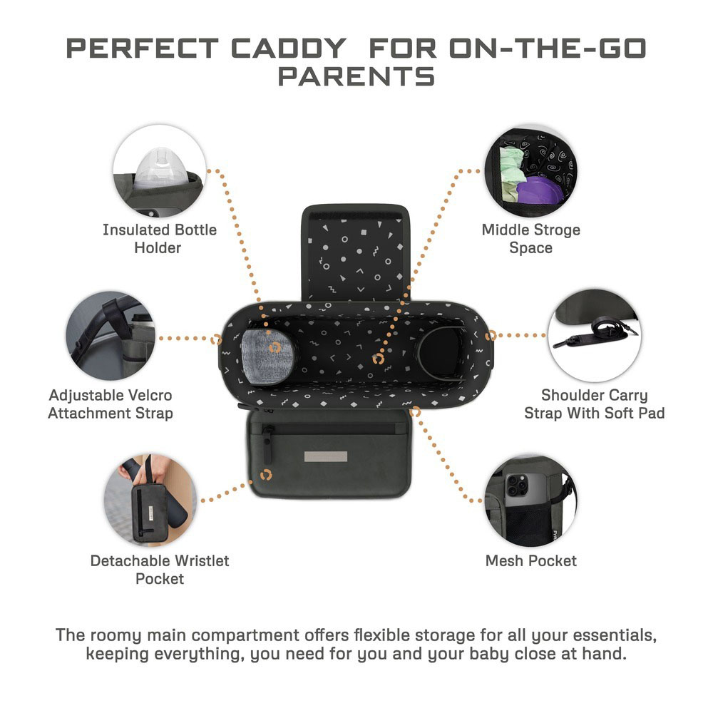 Stroller Organizer Caddy Bag: A universal, multi-functional stroller organizer with smart partitions, featuring an insulated cup holder and a detachable wristlet.