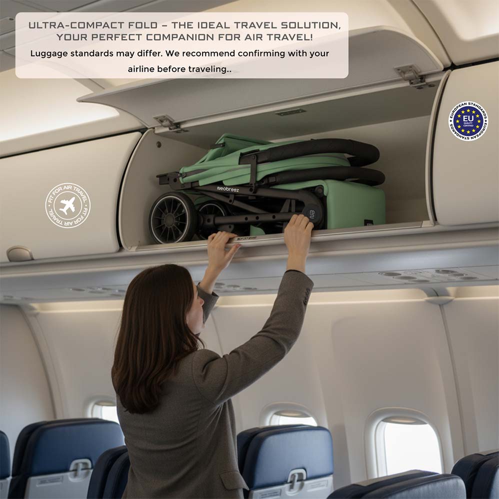 Compact Stroller: Lightweight, cabin-approved travel stroller, featuring a stepless recline, 4-wheel suspension, UPF 50+ canopy, and premium accessories.