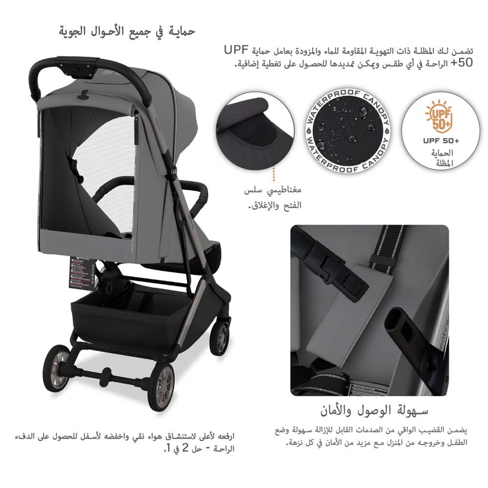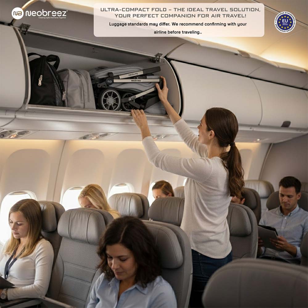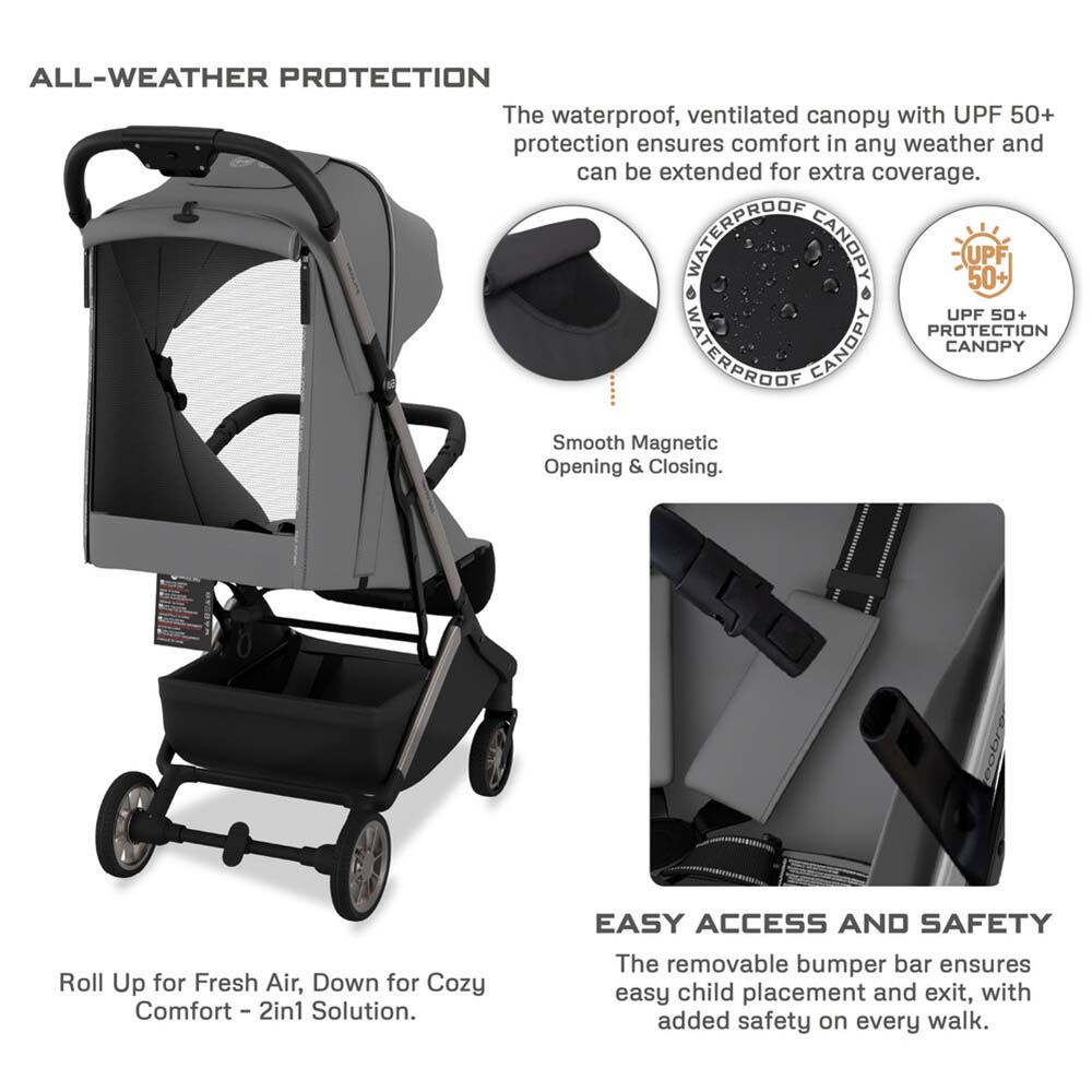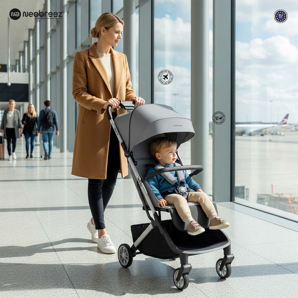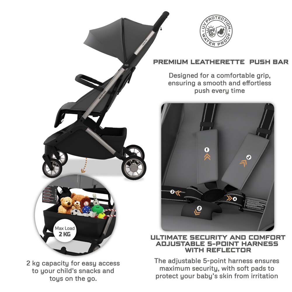 Compact Stroller: An ultra-lightweight, cabin-approved travel stroller, featuring one-hand folding, a durable aluminium frame, multi-position recline, and a UPF 50+ canopy.