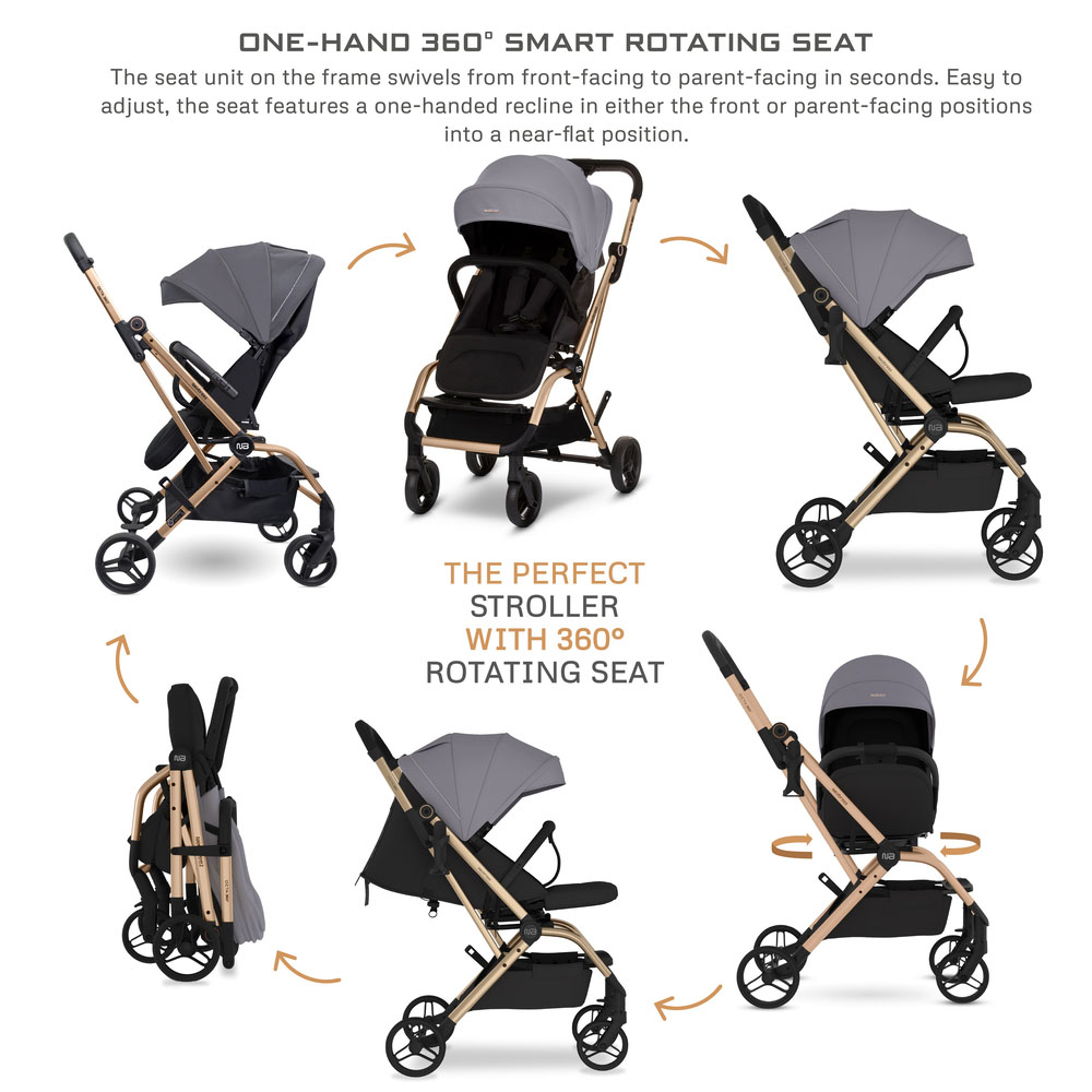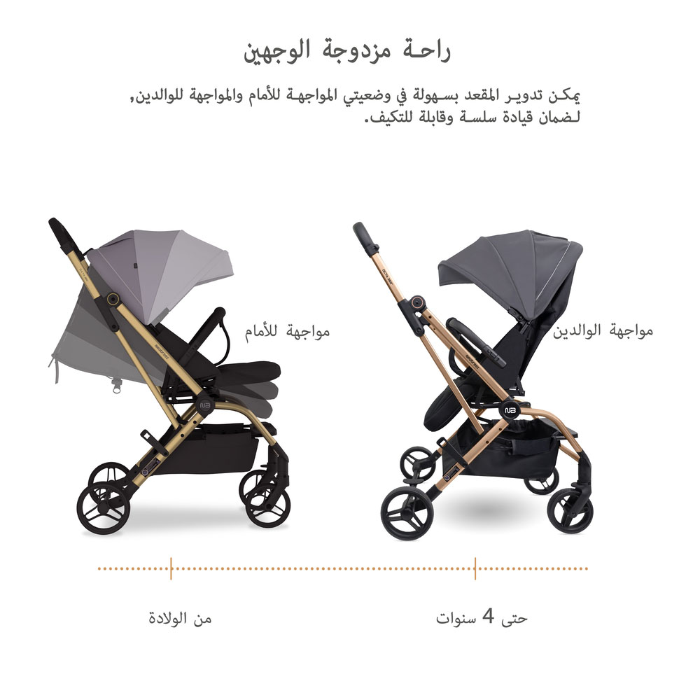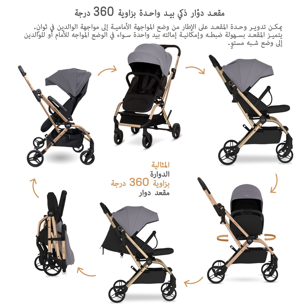 عربة أطفال 360: بدل بسهولة بين وضعية مواجهة الأهل أو الأمام بدوران بيد واحدة. إمالة مسطحة تقريباً ومسند قدم لضمان الراحة.