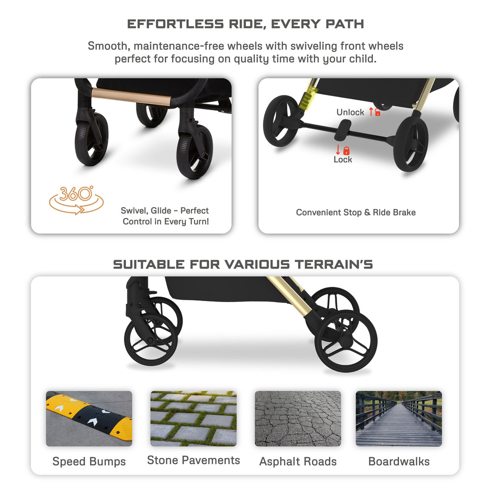 - إطار ألومنيوم مدمج: وزن خفيف، طي ذاتي الوقوف لسهولة السفر.