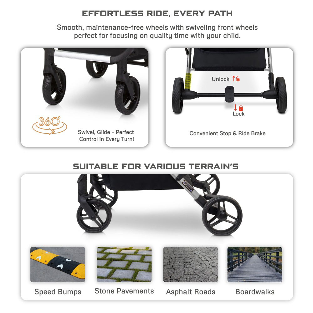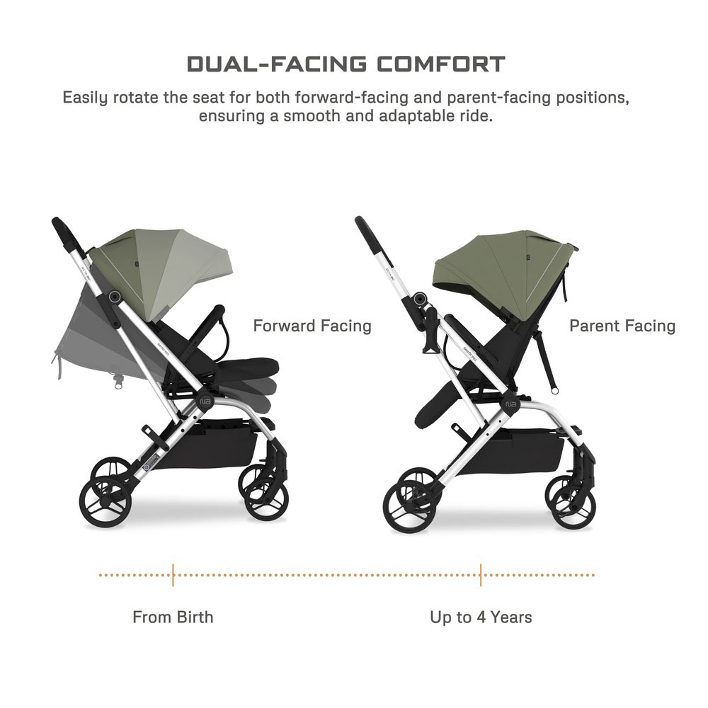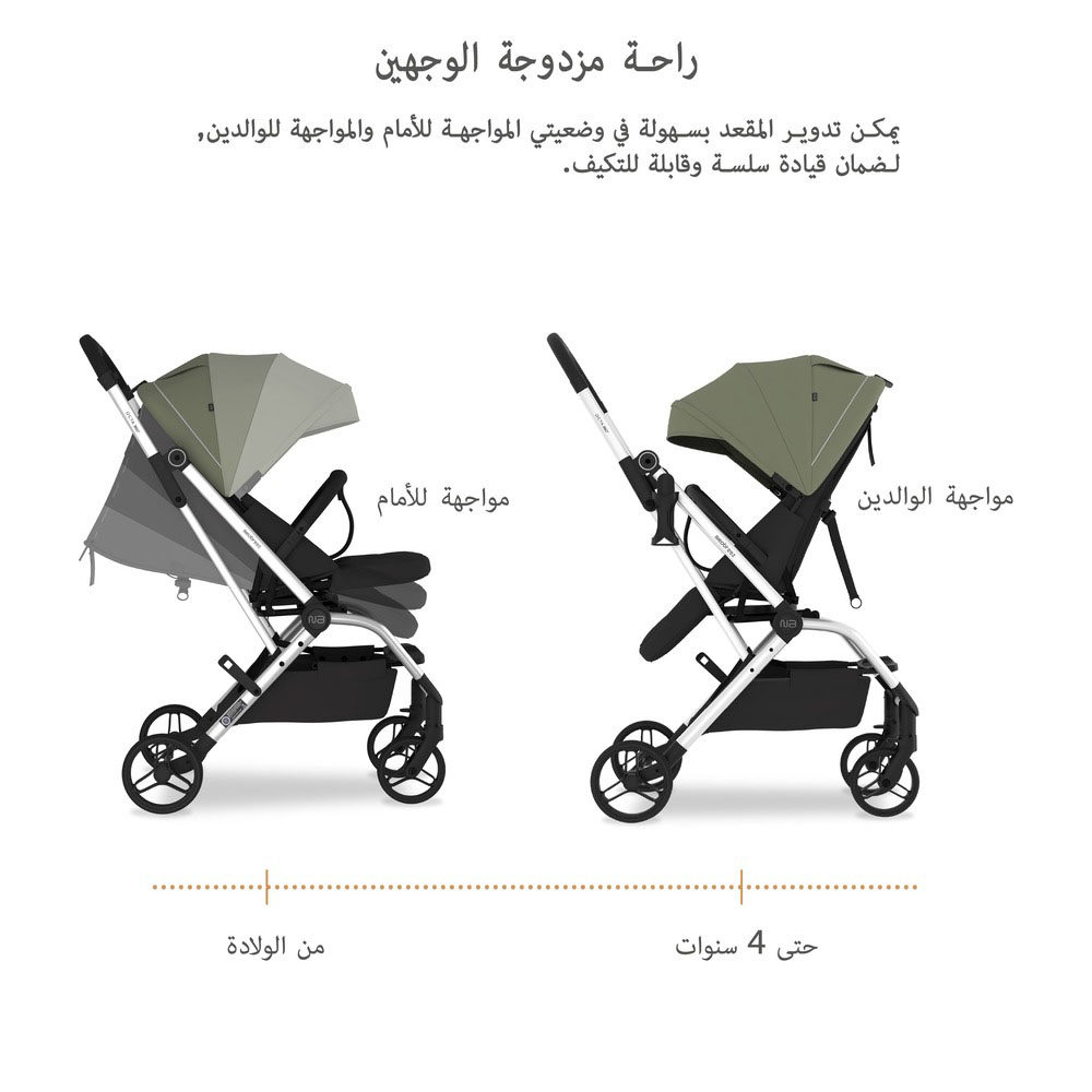 عربة أطفال 360: بدل بسهولة بين وضعية مواجهة الأهل أو الأمام بدوران بيد واحدة. إمالة مسطحة تقريباً ومسند قدم لضمان الراحة.
