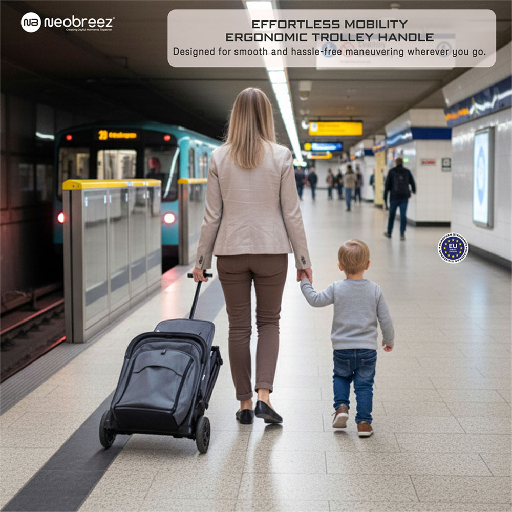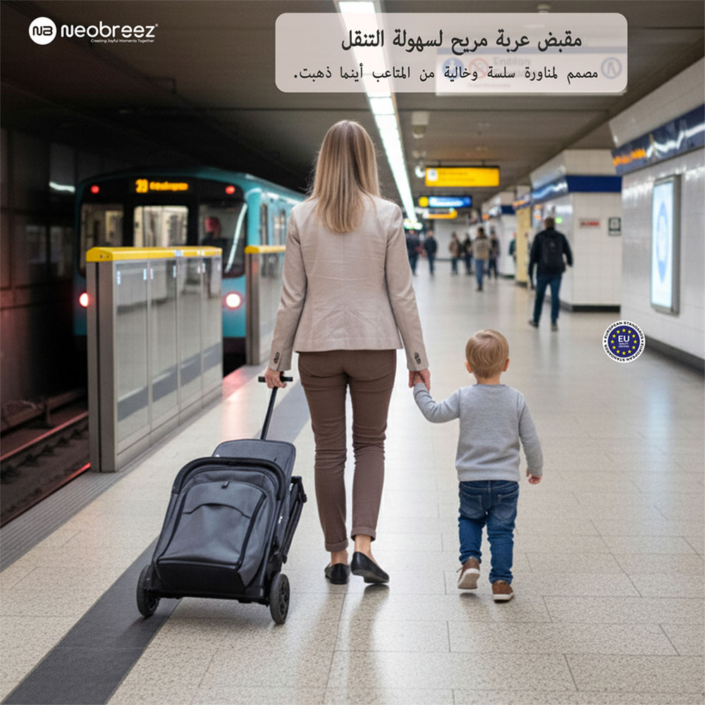 عربة أطفال مدمجة: اطوِها بيد واحدة بقفل تلقائي، واسحبها بسهولة كحقيبة السفر. تناسب مقصورات الطائرة لرحلة سلسة.