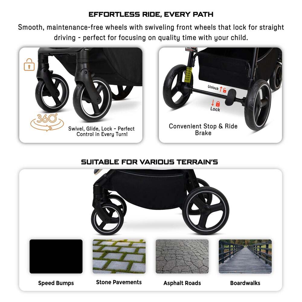 All-Terrain Stroller: Navigate any surface smoothly with foam-filled wheels and a robust all-weather canopy. Designed for long-term use, durability, and features like an adjustable leatherette push bar.