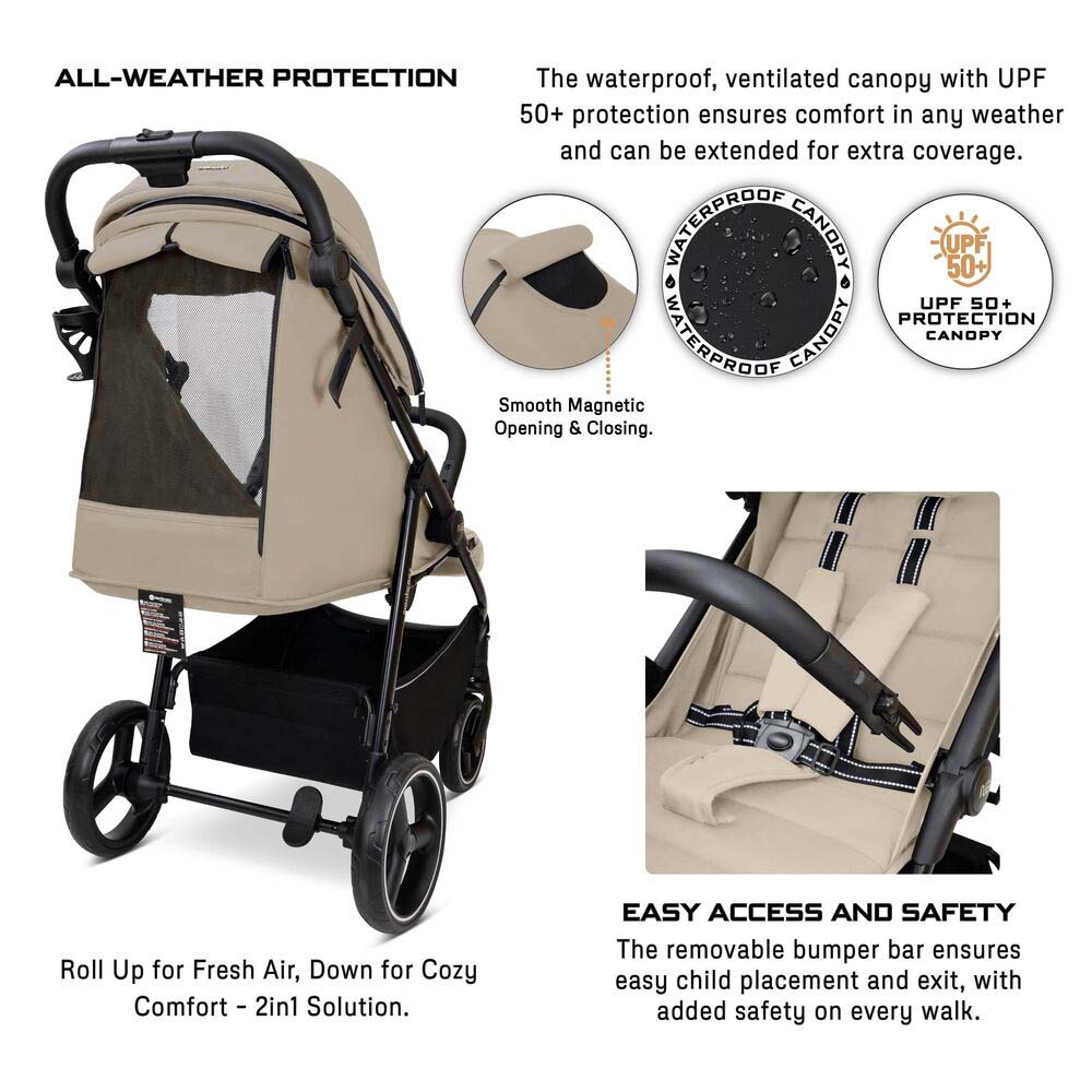 - All-Weather Protection: UPF 50+ water-repellent canopy with ventilation.