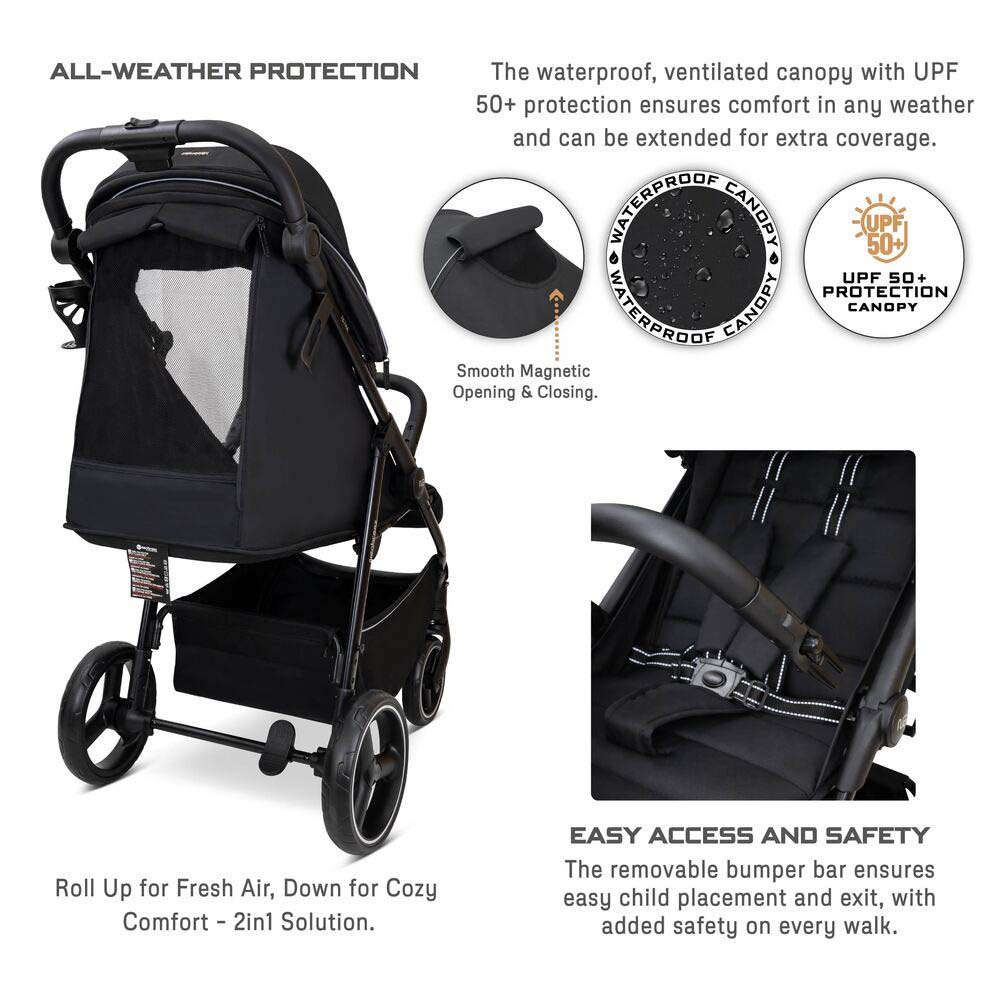 - All-Weather Protection: UPF 50+ water-repellent canopy with ventilation.