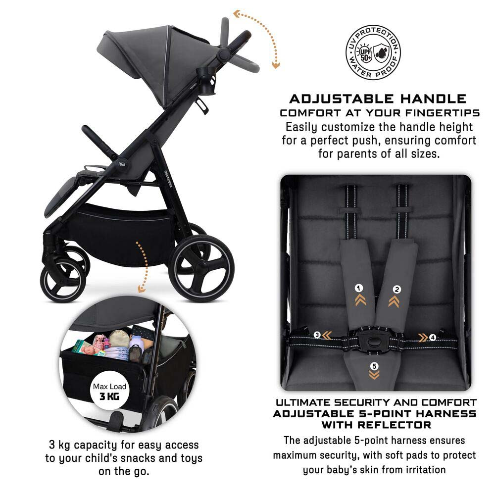 - All-Weather Protection: UPF 50+ water-repellent canopy with ventilation.