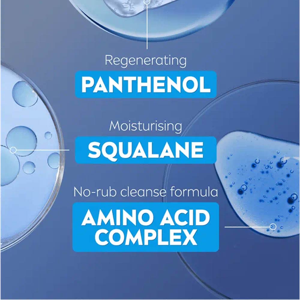 Micellar Water: Removes waterproof makeup; infused with 5% Serum (Panthenol & Squalane). Restores moisture, regenerates, and preps skin for overnight rest.